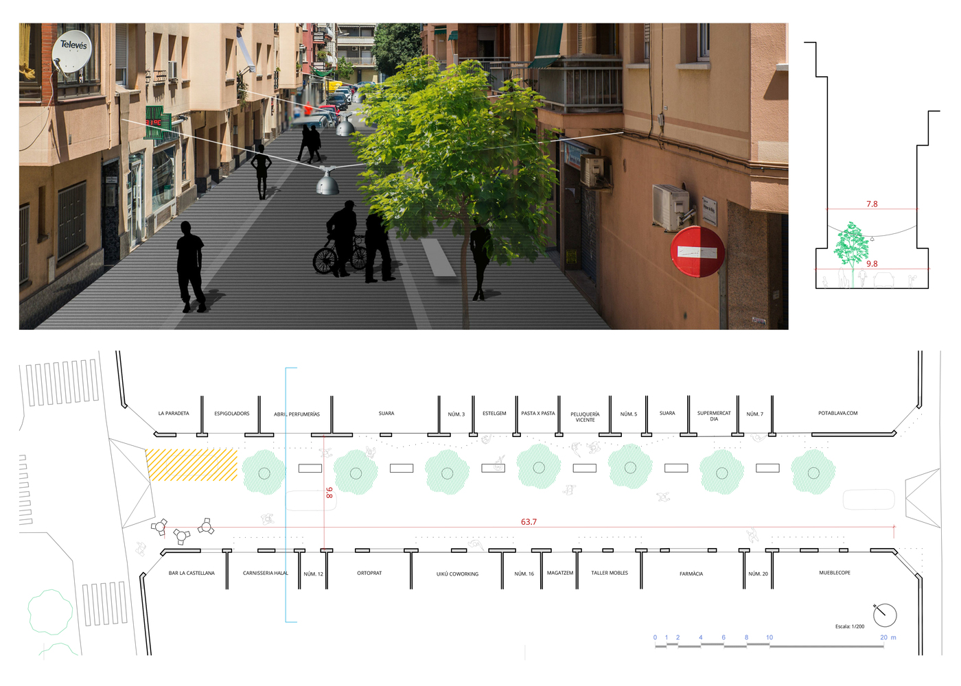 Es un carrer amb poc trànsit i freqüents problemes d’un altre tipus de tràfic... A mes, la il·luminació es deficient i les voreres son estretes. La proposta pretén solucionar part d’aquests problemes a la vegada que promou la interacció entre els diferents locals per afavorir la creació d’un barri cooperatiu. Proporcionaria llocs d’espera per als usuaris del centre de dia i les perruqueries, a mes de permetre que els bars tinguessin un espai exterior tan necessari avui en dia amb el COVID. A mes, la mitjana d’edat dels habitants del carrer es bastant alta i necessiten espais per asseure’s amb qualitat, i per això es proposa també agregar arbres.